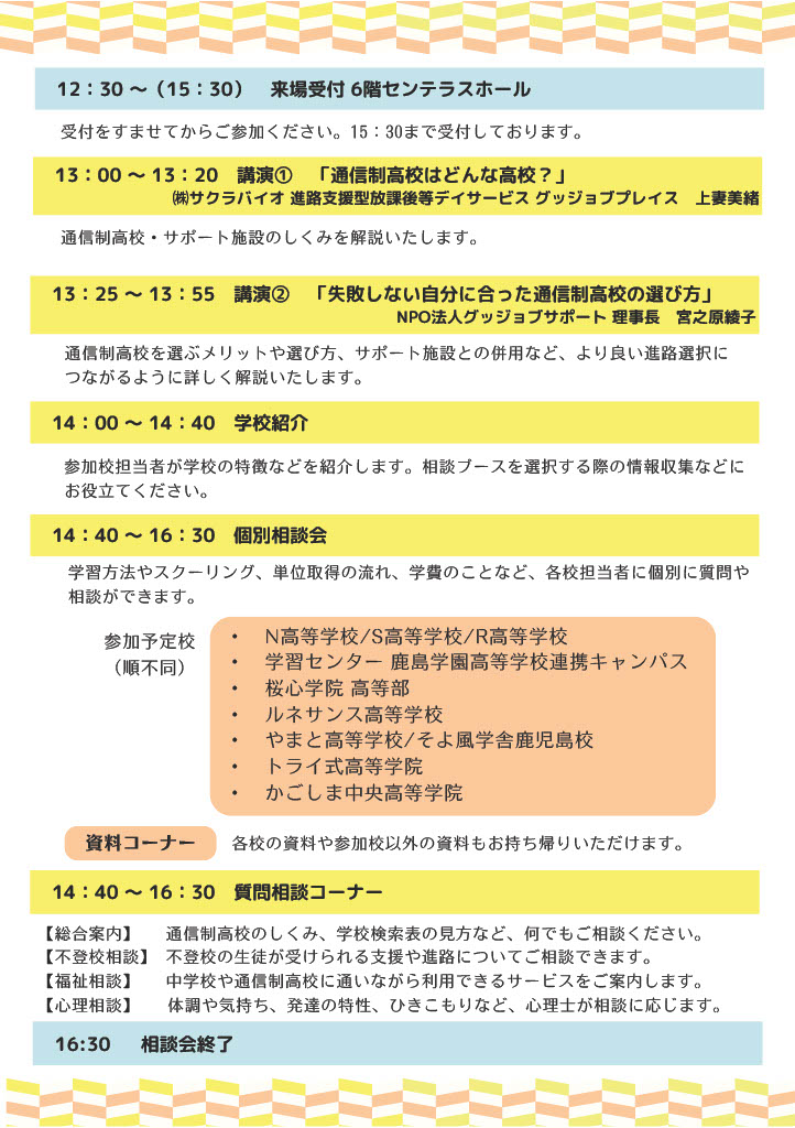 | 内容 | 講演会(通信制高校・サポート施設の仕組み、自分に合った通信制高校の選び方など)、学校紹介、個別相談 |